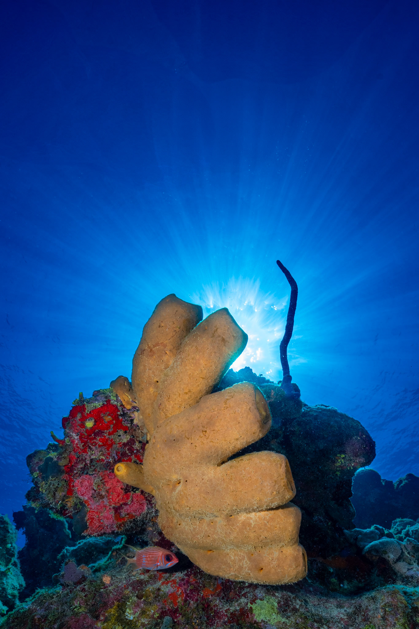 Yellow banded shrimp with eggs, frogfish, cardinal fish and crab in sponge